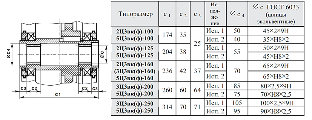 Редукторы всех вариантов сборки выполняются с полым тихоходным валом: а) шлицевым, при этом шлицы выполняются эвольвентными и в двух исполнениях: Исполнение 1 – аналог производства Чехии; Исполнение 2 – аналог производства Санкт-Петербурга;