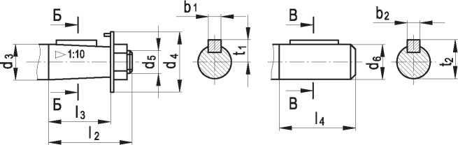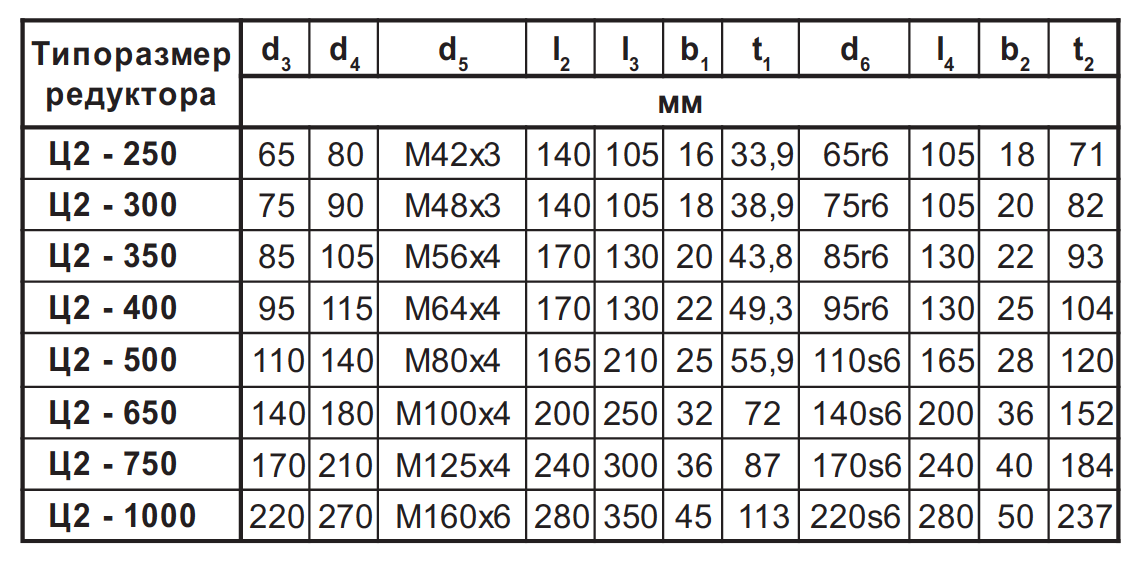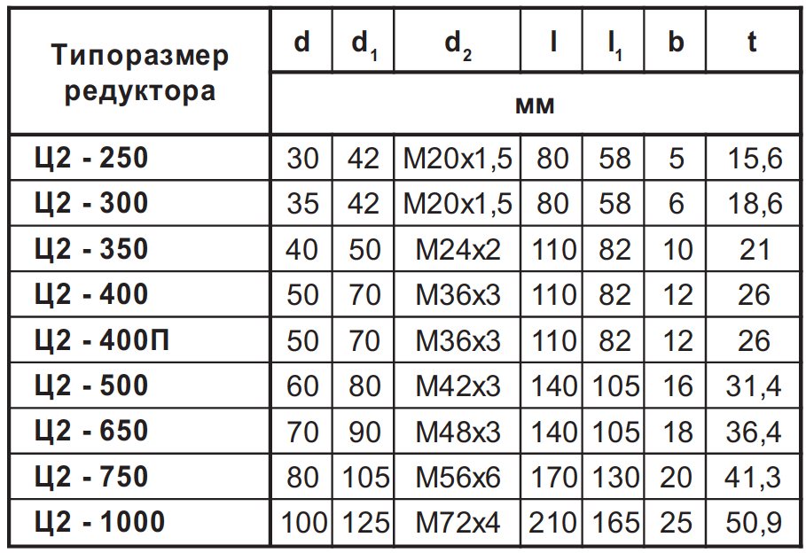 Размеры выходных валов редукторов Ц2-250, Ц2-300, Ц2-350, Ц2-400, Ц2-500, Ц2-650, Ц2-750, Ц2-1000