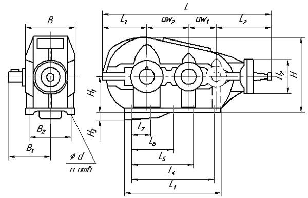 | Типоразмер редуктора | Awт | A | A1 | B | H | H1 | h | h1 | L | L1 | L2 | L3 | L4 | d | п |